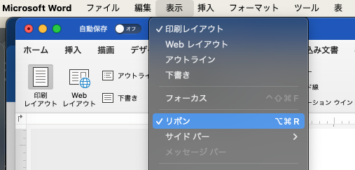 Mac 環境ではホームのリボンにその機能があります。(いろいろなツールがあるリボンが表示されていない場合は「表示」→「リボン」を選択しましょう)